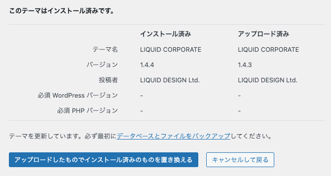 その部分を押下し、次の画面で「更新」を押下するとテーマがアップデートされます。
